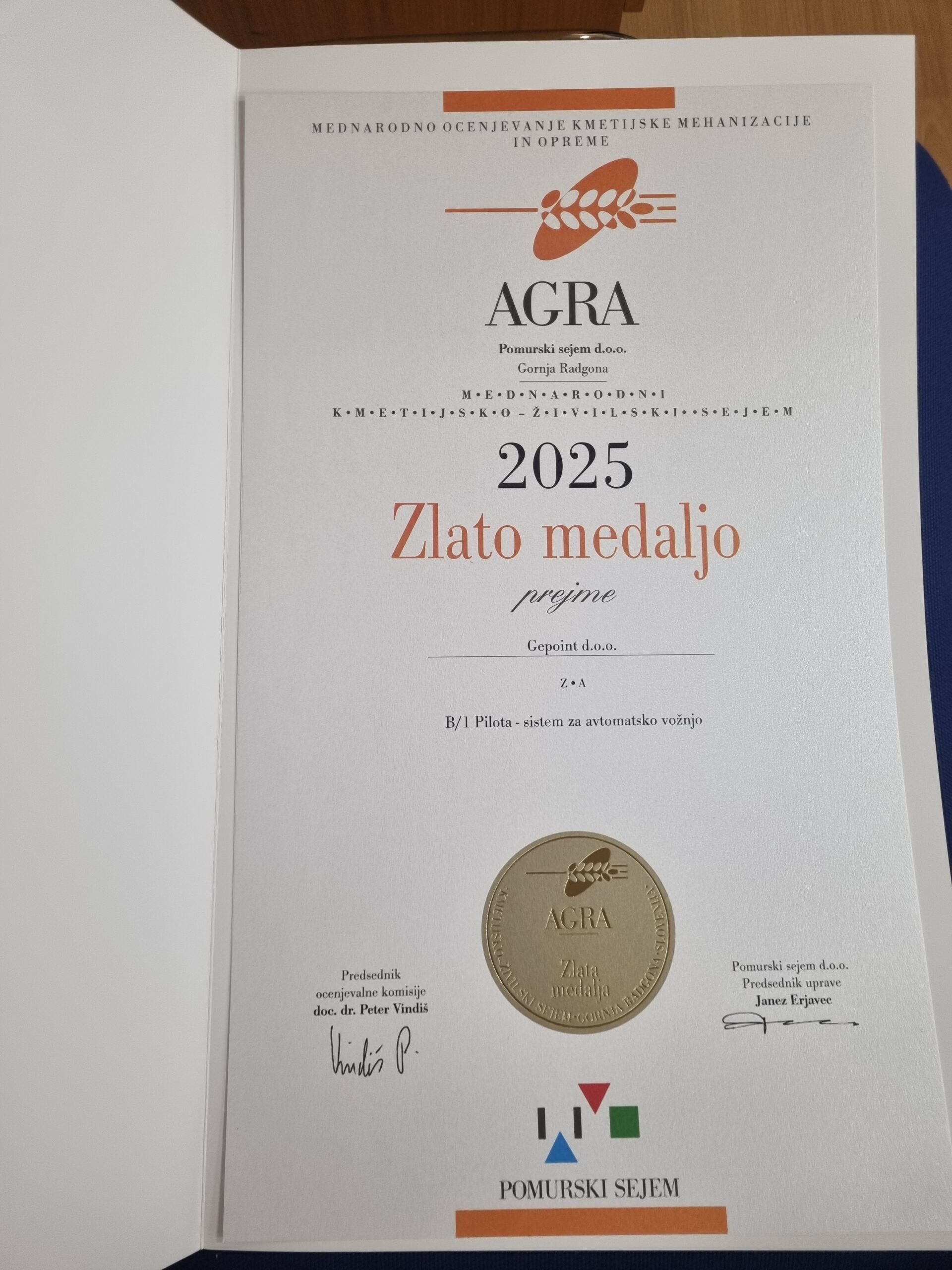 NOVI Pilota komplet za prostoročno, samodejno vožnjo na 2 cm natančno Z MOŽNOSTJO PO SAMOSTOJNI MONTAŽI je prejemnik zlate medalje v kategoriji Mehanizacija – B/1 – Novi proizvodi iz tuje proizvodnje